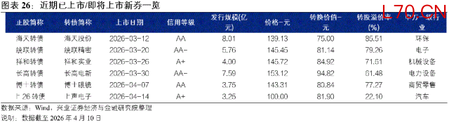截至本周五(2026年4月10日),还有1只已发行未上市的转债:上26转债(评级A+,发行规模3.25亿元),上市日期为4月14日。