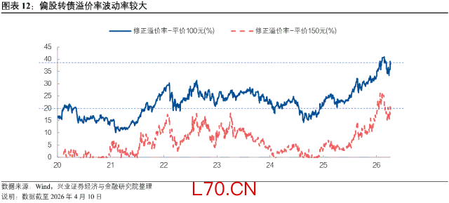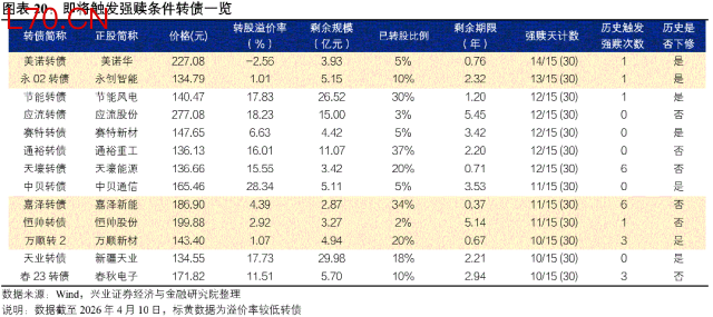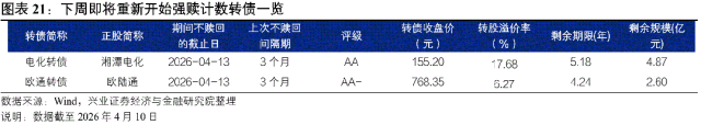 目前已经开始进入强赎计数阶段的转债共47只,其中下周可能触发强赎条件的转债(即还有5个交易日触发强赎)共13只,需要重点关注。从定价表现来看,截至2026年4月10日,美诺转债、永02转债、嘉泽转债、恒帅转债和万顺转2当前溢价水平较低,市场存在一定赎回预期;永02转债、赛特转债和万顺转2过去5个交易日估值分别压缩15.87/9.21/9.24pct。近期市场波动加大,叠加估值高位,市场对于强赎风险的博弈时间点预计进一步提前。