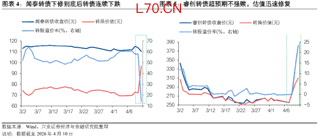 (2)睿创转债超预期不提前赎回,市场开盘即封涨停。4月8日盘后,睿创转债发布公告,董事会决定本次不行使赎回权,并承诺未来12个月均执行提前赎回;从转债定价表现来看,本次不提前赎回明显超市场预期:截至4月8日,睿创转债价格距离此前高点已经下跌超过30%,转股溢价率也从3月初12%逐渐压缩至0附近。除发行人不赎回这一选择超预期外,长达一年的间隔期给予投资者充分信心,次日睿创转债开盘20%涨停,正股大涨7%。截至本周五,流通市值超35亿元的睿创转债连续两个交易日上涨,涨幅达到37.87%,溢价率从0.13%迅速抬升至23.51%。