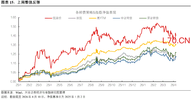 当前处于业绩披露期,基本面为这一时期最重要的定价因素之一,市场更偏向于抱团绩优方向。从行业来看,近期TMT与高景气成长链普遍涨幅靠前,通信板块本周涨幅达到10.74%,而从年初以来2026年盈利预测上修情况看,以AI为主的算力硬件、先进制造出海链、周期涨价链等业绩表现较为退出。本周共有17只转债正股披露2025年度报告,其中业绩表现突出的安克转债、山玻转债等价格明显修复。