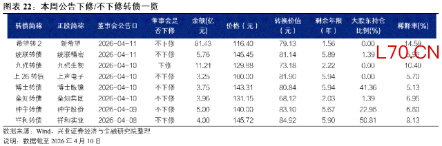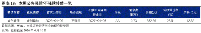 本周仅一只转债公告强赎与否。本周(2026年4月7日-4月12日)仅睿创转债公告不强赎,间隔期为12个月,本次不提前赎回显著超市场预期。