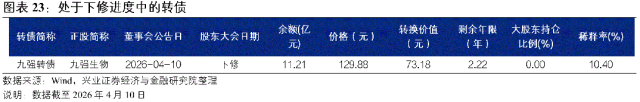 当前处于下修进度中的转债仅有九强转债:闻泰转债剩余期限2.22年,现金对有息负债覆盖中等,转债剩余规模还有11.21亿元;当前转债平价约73元,积极关注本次下修到位情况。