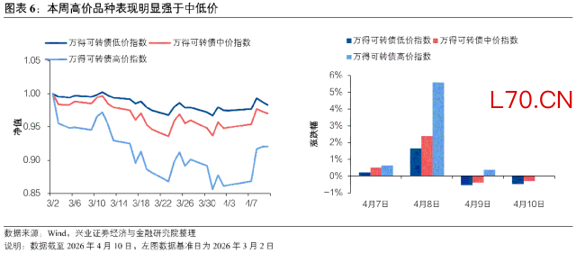 表现分化的背后是中低价转债相对正股的偏弱,而股性品种仍能跟住正股。本周转债整体修复,但不同价格品种表现有明显差异,中低价转债相对承压,表现偏弱,而偏股品种则受益于风偏修复已经风格切换,跟涨能力更强;从指数表现来看,万得可转债高价指数本周上涨6.68%,而低价/中价指数涨幅仅0.88%/2.21%。