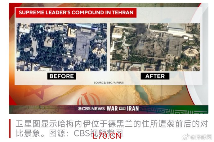 美媒发布卫星图,显示哈梅内伊住所遭袭的前后对比景象