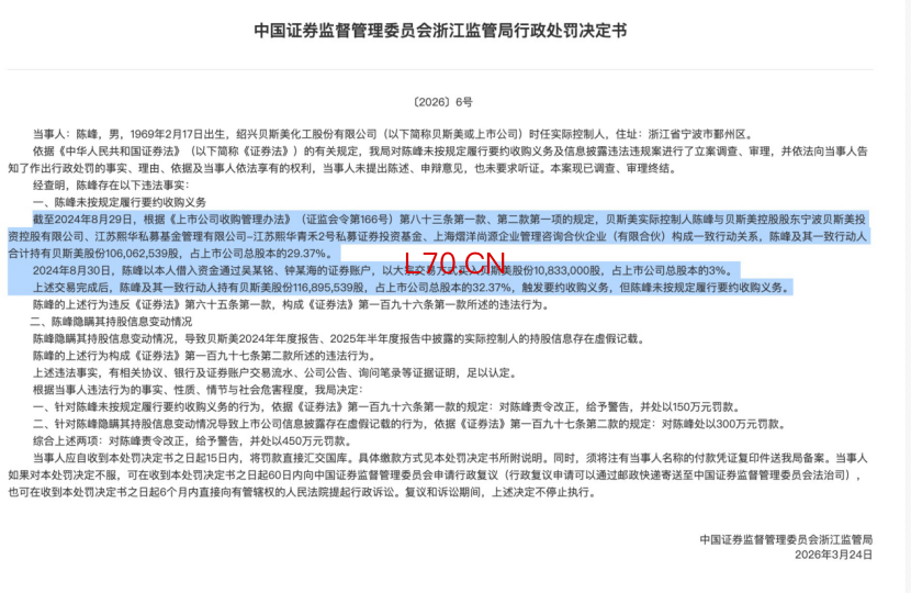 浙江证监局近日披露, 针对“未按规定履行要约收购义务”及“隐瞒持股信息变动情况”两类违法行为,农药上市公司贝斯美(维权)时任实控人陈峰被该局责令改正,给予警告,合计罚款450万元。