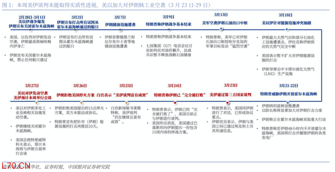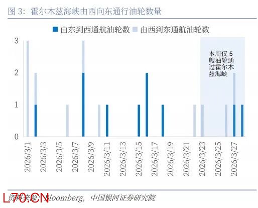 本周(3月23日-29日)热点事件跟踪:(1)特朗普再现“TACO”式反复表态。特朗普在3月21日(当地时间)威胁伊朗必须在48小时内开放霍尔木兹海峡,否则将摧毁其各类发电站,但3月23日便释放战争缓和信号,称与伊朗进行了“富有成效”对话。(2)美伊谈判虽已开启,但双方分歧仍大,本周未能达成协议。3月24日特朗普称伊朗已经“完全被打败了”,美国目前正与伊朗进行谈判。26日,伊朗拒绝美国提出的15点停火方案,双方未能达成协议。(3)霍尔木兹海峡油轮通行仍极为受限。Bloomberg数据显示,本周仅5艘油轮通过霍尔木兹海峡,较冲突爆发前一周(2月23日至27日)的296艘下降98.3%。