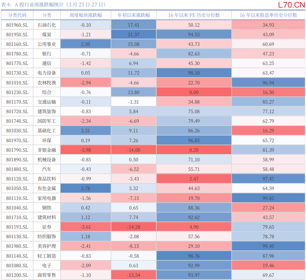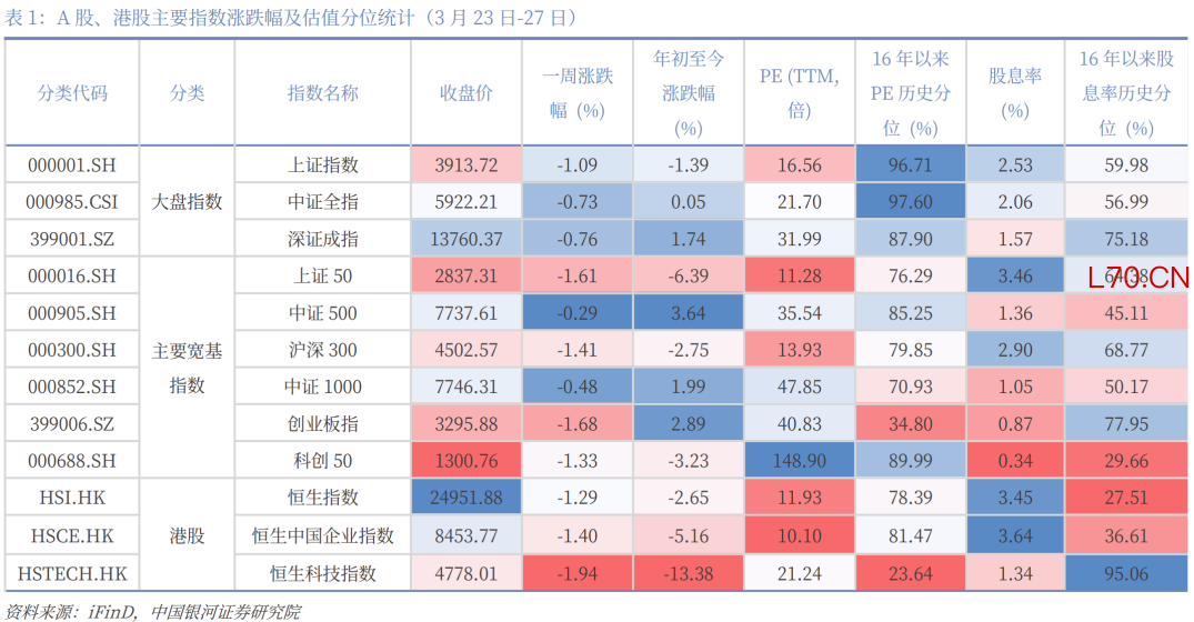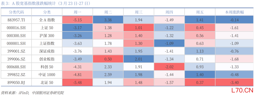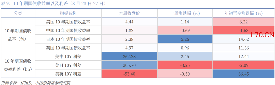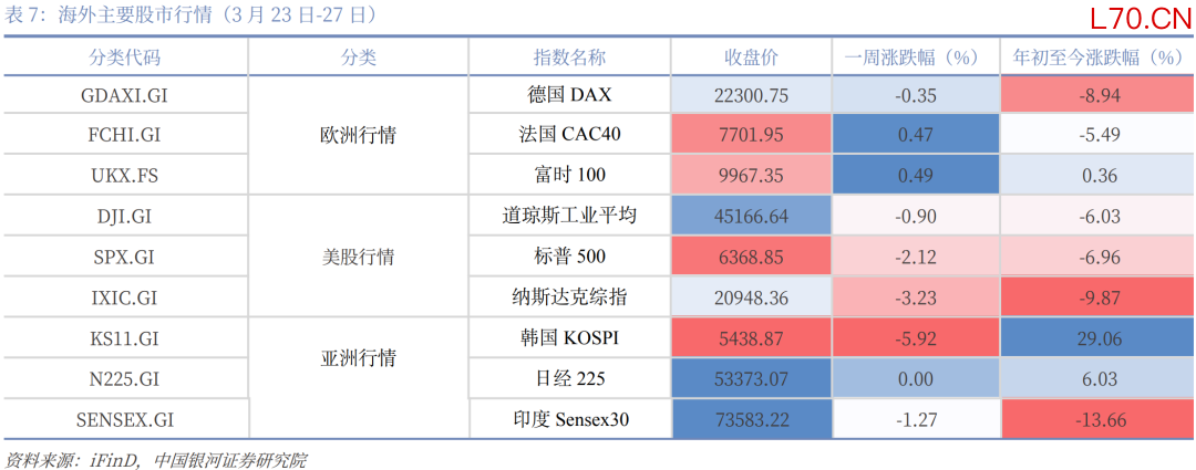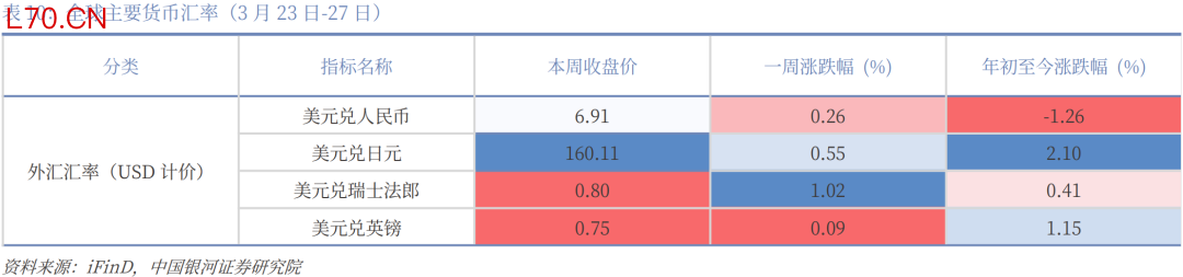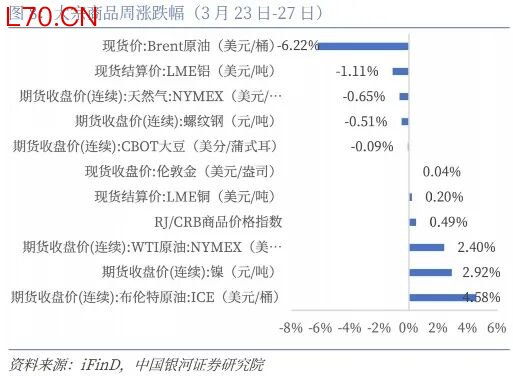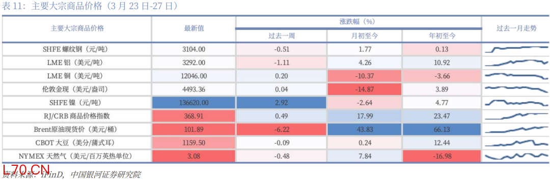 本周焦点(3月23日-29日):特朗普“压力线”或已逐渐显现。自美以伊冲突升级以来,原油价格与美国国债收益率走势大体一致,而每当原油价格、美债收益率上升至一定敏感区间(如布伦特原油连续合约BRN0Y突破100美元/桶后),特朗普政府往往会释放缓和信号,以引导市场预期降温。资本市场已经定价“通胀”,本周开始初步定价“衰退”,如果战争不能在4月份展现稳定的结果,“衰退”将正式被计入价格。鉴于5月份美国总统需要国会授权继续军事行动,6月份要开启中期选举路演,4月份更为关键。4月上旬若战争形势未明显缓和,全球资本市场、非美汇率市场、商品市场仍然承压,预计4月下旬形势将有所好转;本周美元持续走强,非美货币继续承压,美国三大股指齐跌,道琼斯工业平均指数跌0.9%,标普500跌2.12%,纳斯达克综指跌3.23%,但美债下跌幅度减弱,初步表现出“衰退”定价。中国资产在全球股市中表现相对更好,沪深300下跌1.41%,国债止跌,10年期国债收益率则由1.83%小幅降至1.82%。贵金属止跌,黄金本周收于4493.36美元/盎司,与上周几乎持平。LME铜涨0.2%。原油继续上行,WTI原油期货报101.18美元/桶,较上周上涨2.4%。