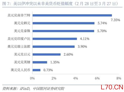 全球资本市场短期定价仍由地缘博弈主导,主要股指多数下跌:(1)本周韩国KOSPI指数跌幅最大,跌5.92%。以色列TA125指数本周跌5.22%。复盘冲突爆发后全球主要股指涨跌幅情况(2月28日至3月27日),韩国由于其股市中科技股权重较高,且能源高度依赖进口,对本轮冲击敏感度最高。韩国KOSPI累计跌幅达12.9%。欧洲市场亦因能源进口依赖较高而明显承压,德国DAX、法国CAC40累计跌幅分别达11.8%、10.24%。(2)本周美国股债同跌,三大股指全部下跌,长端国债收益率上行,美元指数走高。本周道琼斯工业平均跌0.9%,标普500跌2.12%,纳斯达克综指跌3.23%。美国10年期、30年期国债收益率升至4.44%(上周收盘4.39%)、4.98%(上周收盘4.96%),已至12个月高位。英国和日本10年期国债收益率随之分别上升5个基点和12个基点。美元指数(DX0W.NBT)收盘报100.05,较上周上涨0.75点。美元走强背景下,非美货币继续承压。美元兑日元收报160.11,较上周五收盘159.25进一步上行,突破160关口;美元兑韩元收报1506.2(上周五收盘1499.7)。美元兑人民币汇率收报6.91,较上周五收盘的6.89小幅上升。此外,美元兑印度卢比、南非兰特均上升,对应货币均出现不同程度贬值(图7)。(3)中国资产在全球股市中表现相对更好。A股、港股主要股指普遍回落,沪深300周跌1.41%,恒生科技指数周跌1.94%。国债止跌,10年期国债收益率则由1.83%小幅降至1.82%。对比美以伊冲突以来全球资产表现(2月28日至3月27日),人民币资产整体表现相对平稳。权益市场中,A股、港股主要指数跌幅相对靠后。外汇方面,人民币在主要非美货币中贬值幅度最小,显示出较强韧性。