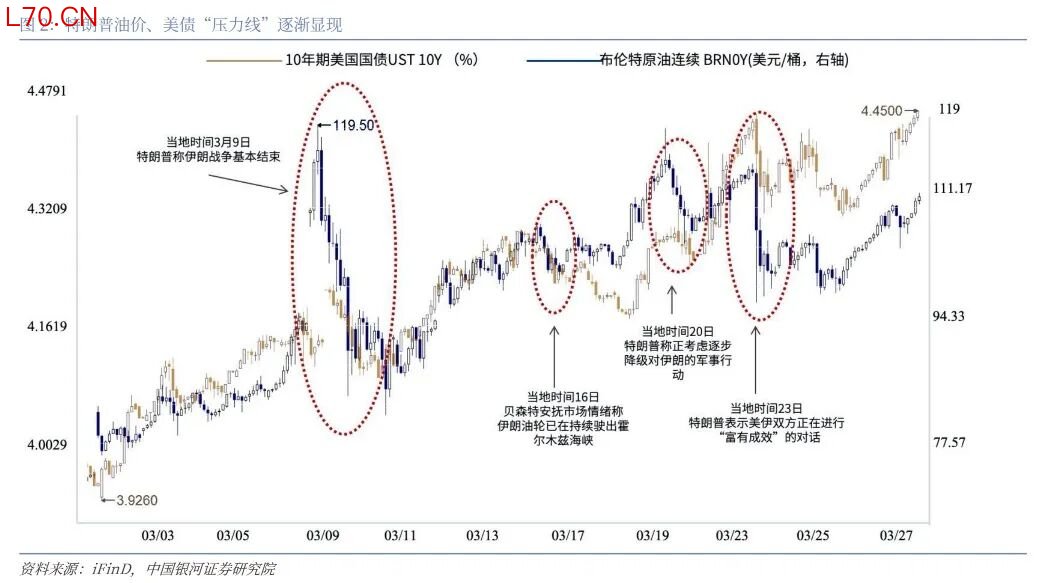 特朗普“压力线”或已逐渐显现:自美以伊冲突升级以来,原油价格与美国国债收益率走势大体一致,而每当原油价格、美债收益率上升至一定敏感区间(如布伦特原油连续合约BRN0Y突破100美元/桶后),特朗普政府往往会释放缓和信号,以引导市场预期降温(图2)。当地时间3月23日,特朗普就伊朗局势发表“美伊谈判”言论后,市场缓和预期迅速升温,原油期货价格当日明显回落。然而,由于随后伊朗强硬表态,美伊谈判未能取得实质性进展,油价在周内再度回升。截至3月27日,WTI原油期货报101.18美元/桶,较上周上涨2.4%;布伦特原油ICE期货报114.57美元/桶,较上周上涨4.58%。黄金本周收于4493.36美元/盎司,与上周几乎持平。黄金流动性较好,冲突爆发后部分央行及投资者的抛售导致金价下跌,土耳其央行黄金储备在3月13日、20日当周分别减少6吨、52.4吨。本周特朗普TACO言论及战争回温共同导致黄金波动,短期地缘政治不确定性较高,金价仍面临较大波动风险。