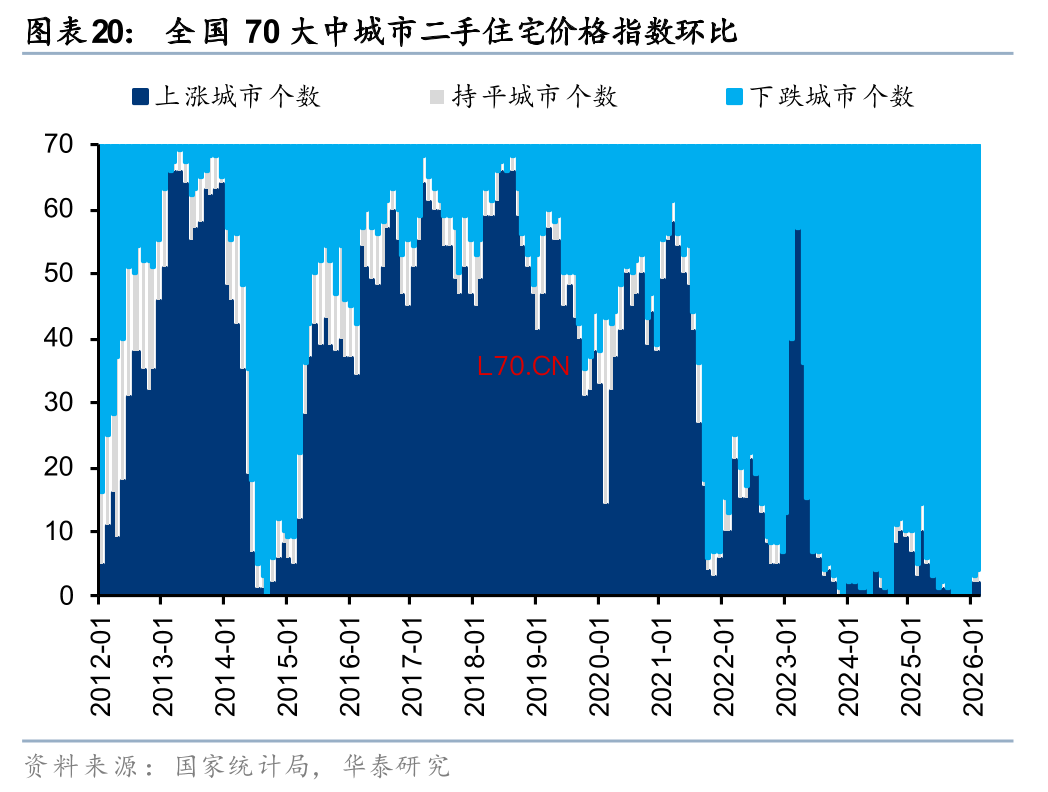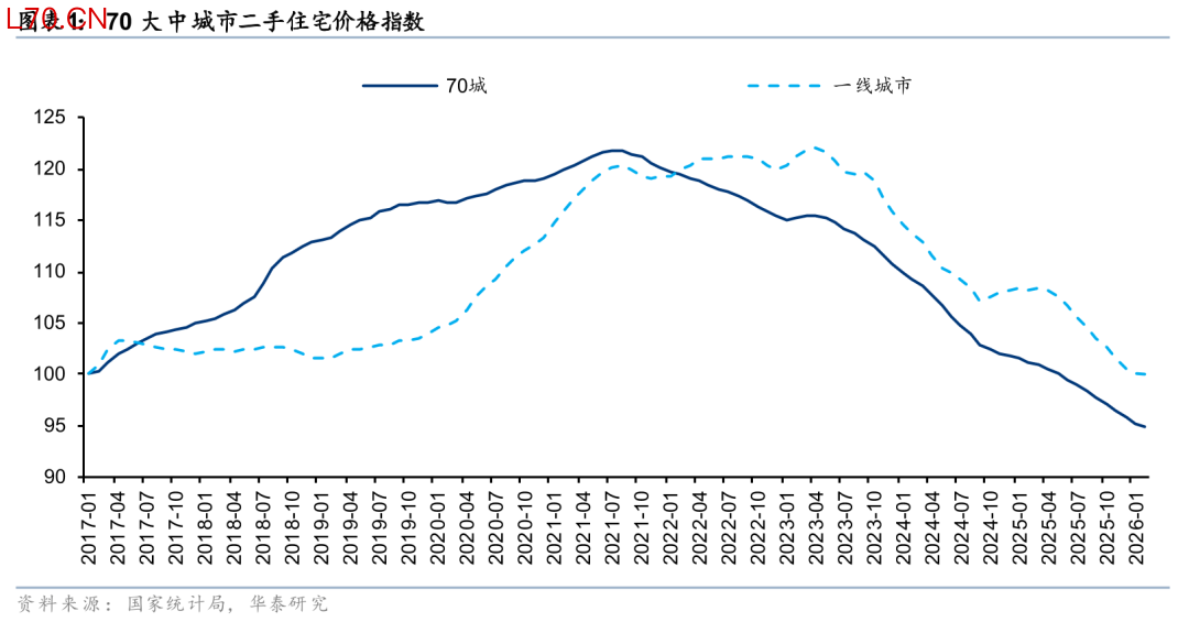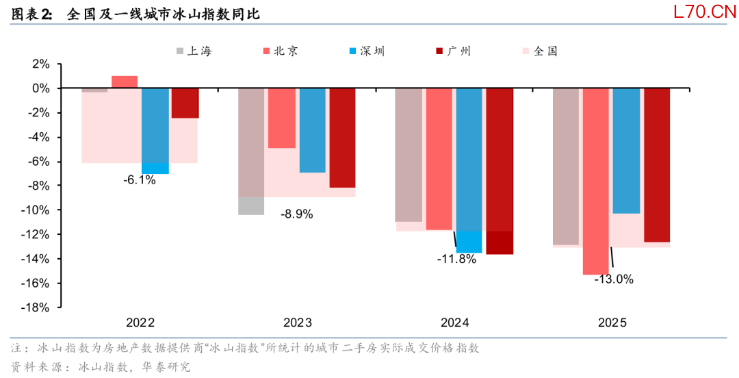 2021年以来,除了部分政策窗口期,我国房价整体呈现一阶导持续下跌状态。据统计局数据,70大中城市二手住宅价格指数2022、2023、2024、2025年分别累计下跌3.9%、4.1%、8.0%、6.1%,其中2024-2025年为跌幅最大的两年。2025年房价跌幅虽然较2024年有所收窄,但2025年下半年以北京上海为代表的一线城市跌幅大于全国,也大于其历年水平。这也再次使得市场对于我国房地产市场企稳时点仍有疑虑。