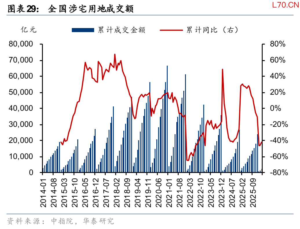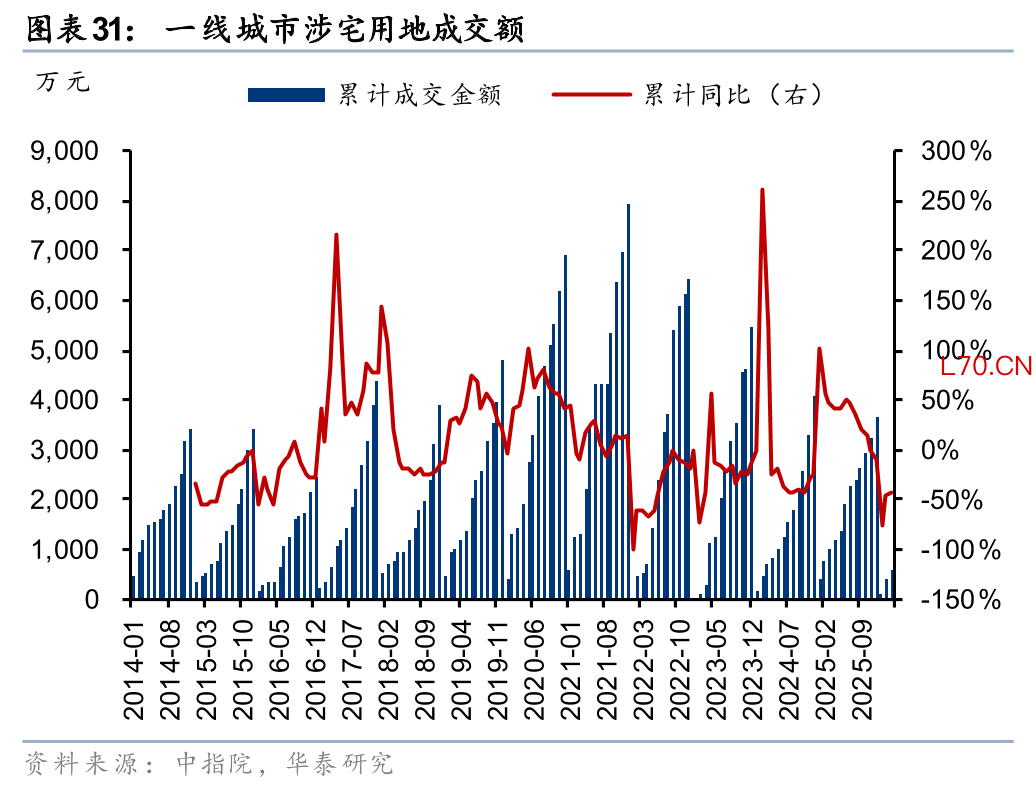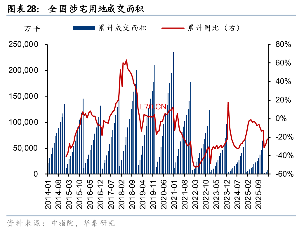 房价二阶导转正阶段,对于房地产投资链条意义可能较弱。房企由于历史库存压力,以及对未来房价预期不明,扩表投资意愿预计依然偏弱。2026年一季度土地市场成交规模同比进一步收缩,全国涉宅用地成交面积/成交金额同比分别下降22%/42%,降幅较2025年全年拉大10/32pct。其中一线城市也在收缩,涉宅用地成交面积/成交金额同比分别下降21%/44%,成交面积降幅较2025年全年小幅收窄2pct,但成交金额降幅拉大33pct。