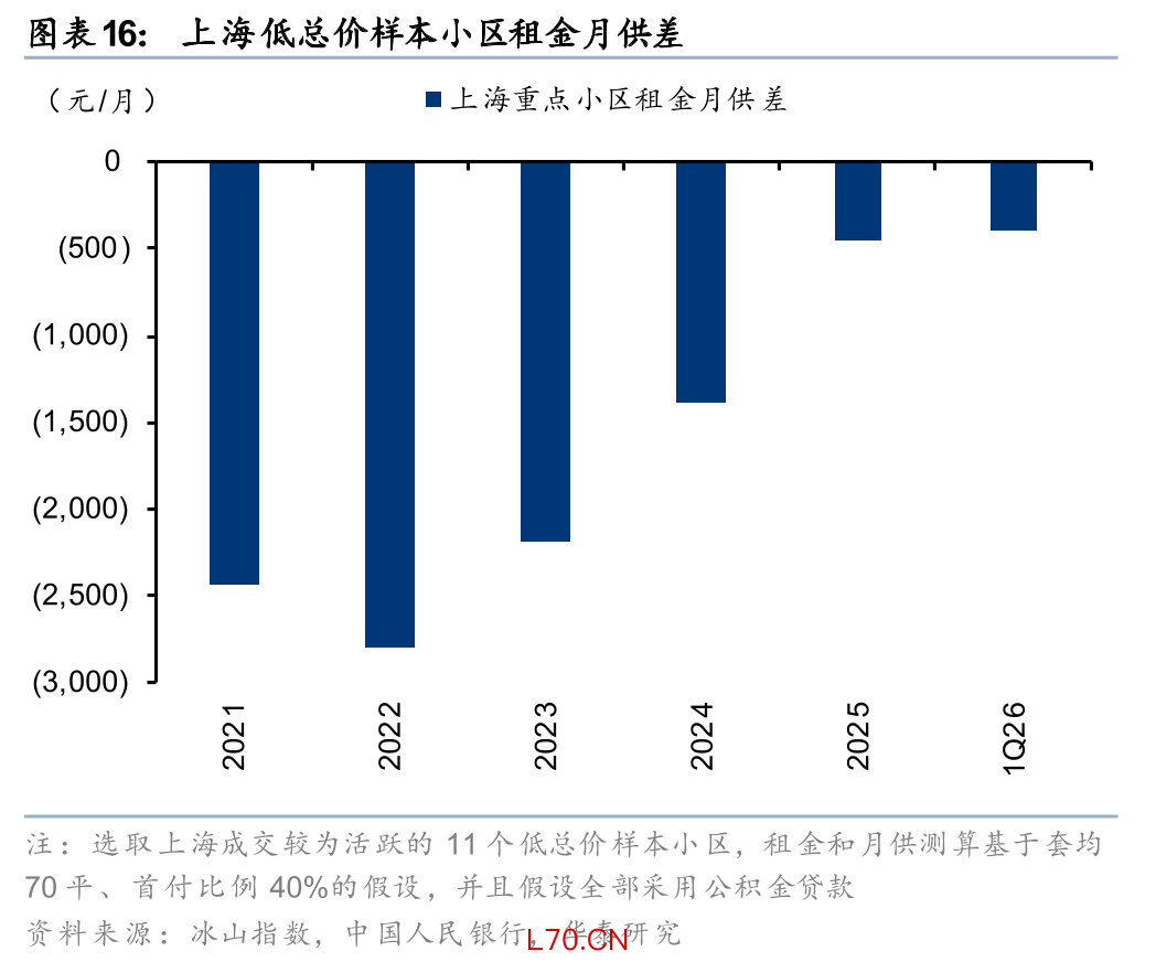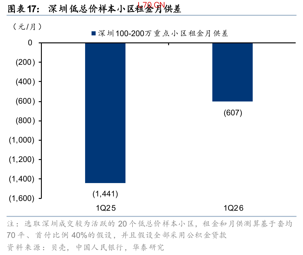 据我们测算,近年来一线城市部分低总价房屋的“租金月供差”开始持续收敛,部分小区开始出现租金超过月供的情况。这些小区有一些共同的特征:1、处于城市外围;2、面积段较小(70平米以下)。我们整理了上海和深圳成交较为活跃的低总价样本小区数据,测算发现(按照70平米户型、40%首付比例、对应时期公积金贷款利率、30年贷款周期等测算),近年这些小区的“租金月供差”明显收敛:上海样本小区的“租金月供差”从2021年的-2700元/月左右回落至今年的-500元/月左右,深圳样本小区“租金月供差”从2025年初的-1400元/月左右回落至今年的-600元/月左右。随着租房家庭发现家庭月供与租金差距逐步收敛,有望驱动租房者转向购房(租房不合算)。