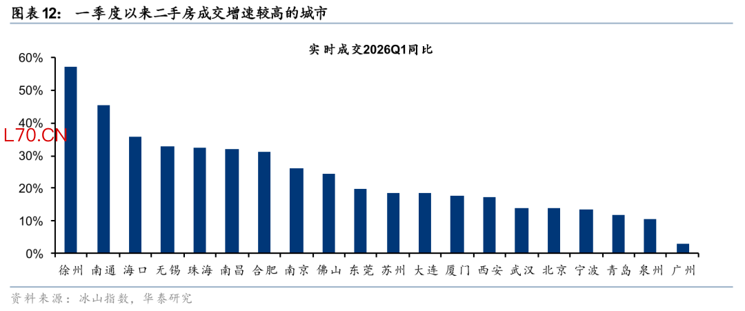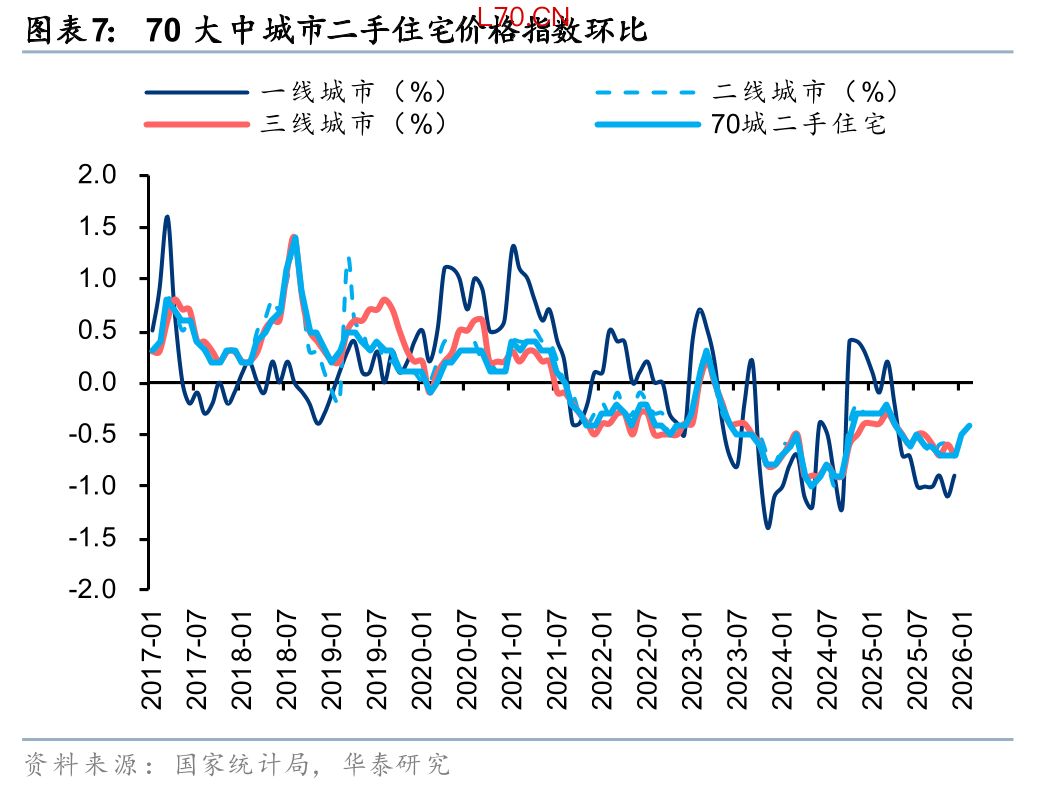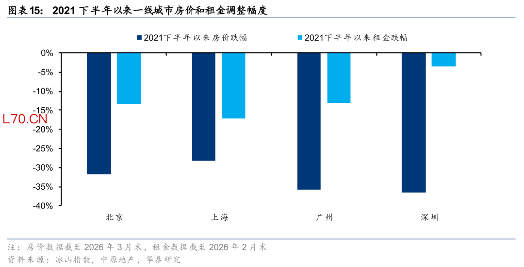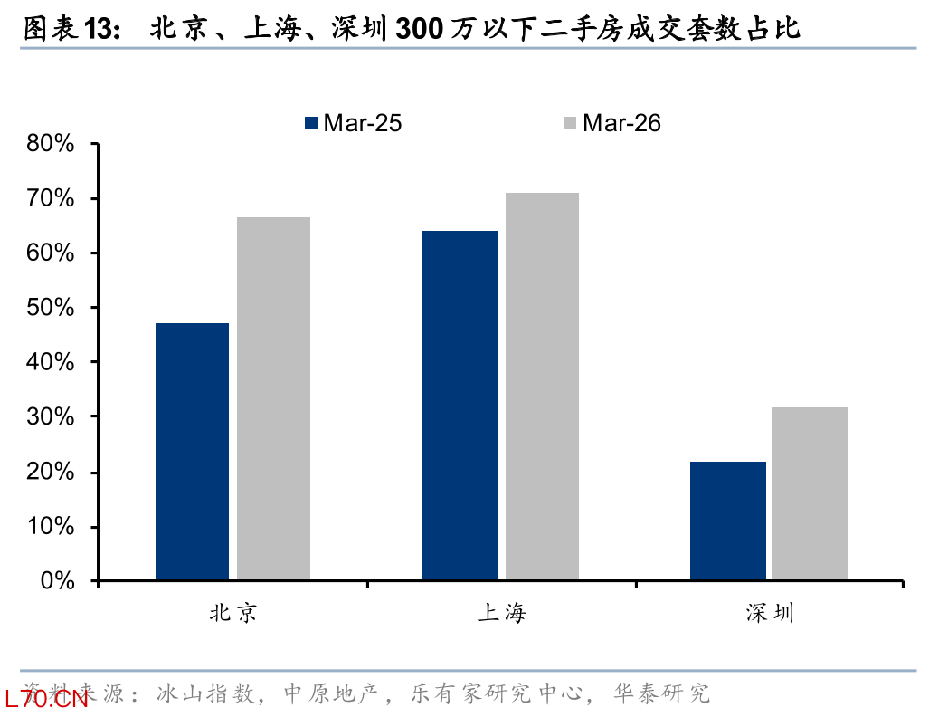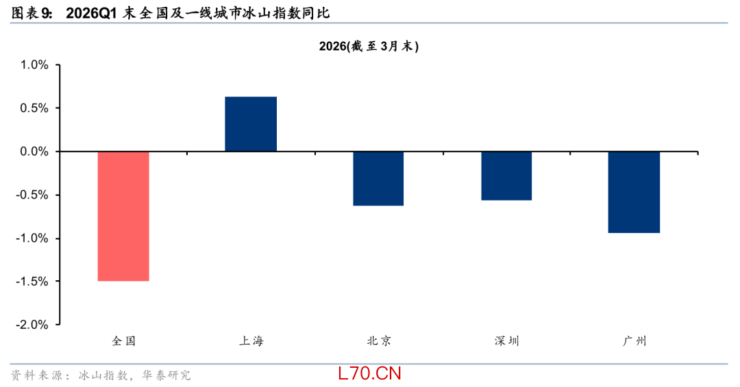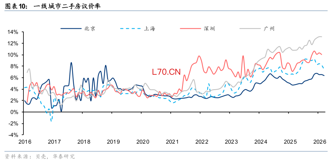 但其中结构性改善已经有所体现。一线、二线、三四线城市今年一季度累计跌幅为0.4%/1.5%/1.6%,一线城市房价更具韧性。北京、深圳、广州环比跌幅分别为0.3%/0.4%/0.4%,优于全国,而上海在新政加持下,年初以来房价累计同比涨幅达0.6%。此外,根据贝壳的数据,1Q26北京、上海、深圳二手房议价率较4Q25的高点收窄0.3/1.7/0.7pct,印证市场情绪的边际好转。