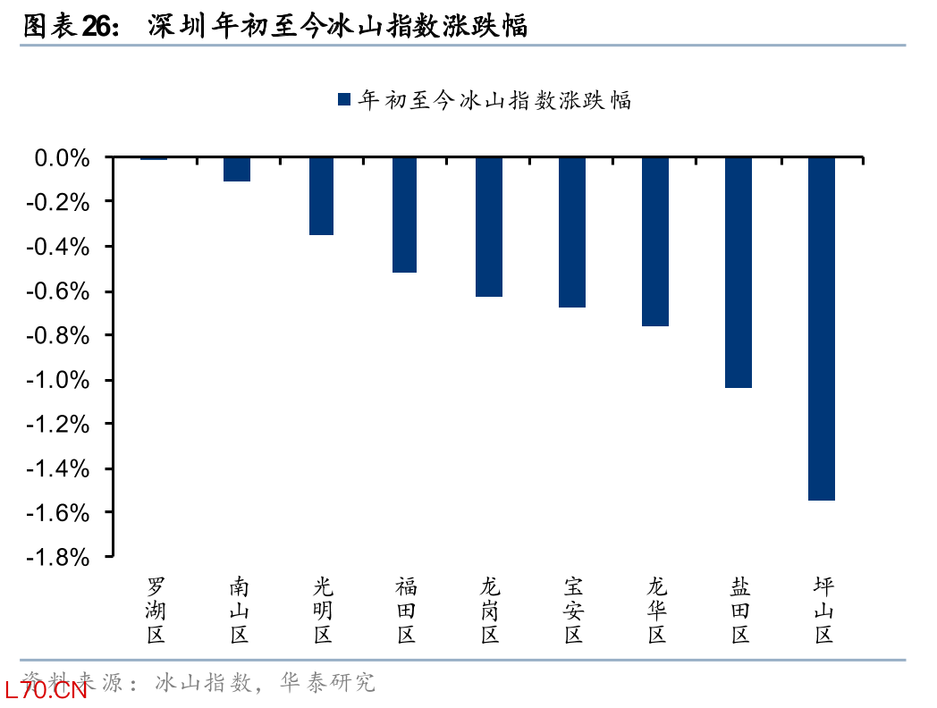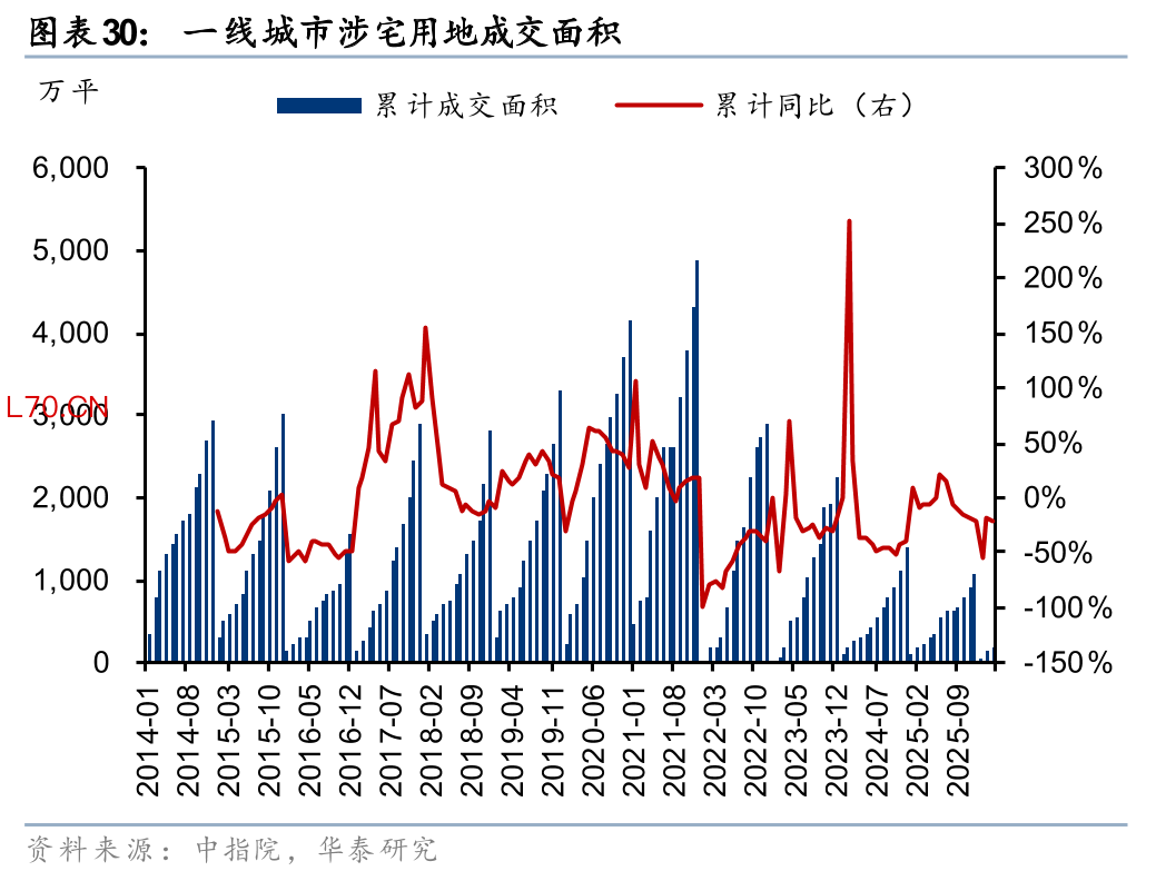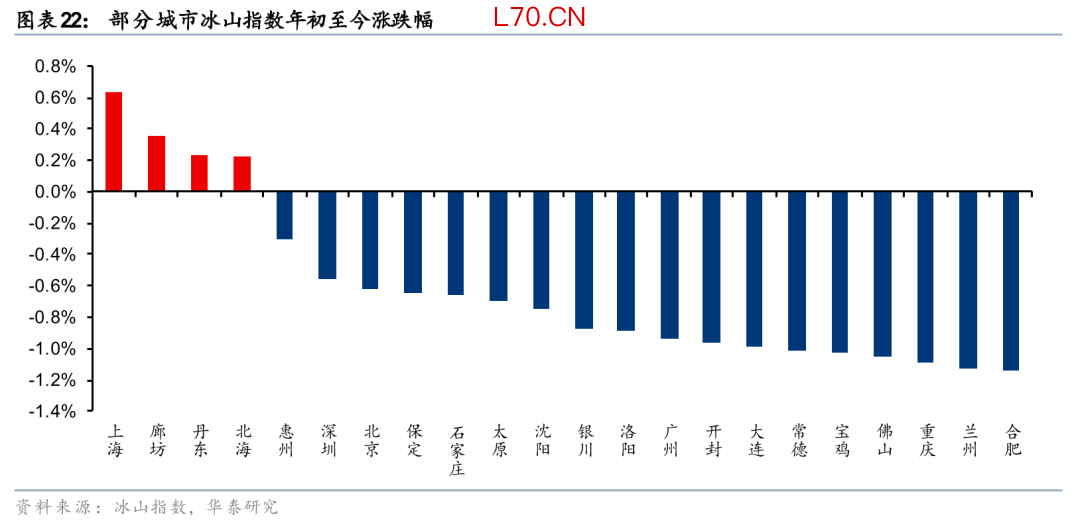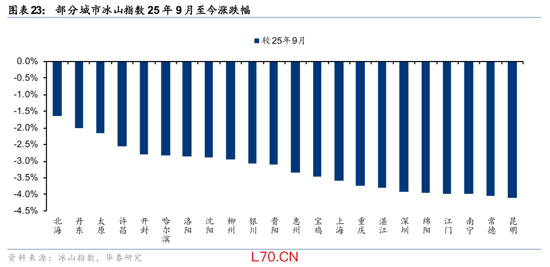 我们观察到除上海房价指数出现回稳外,廊坊、丹东、北海等偏低能级城市冰山指数亦出现一定的回稳迹象。前述4个城市今年以来累计涨幅达0.6%/0.4%/0.2%/0.2%。以半年为维度,跌幅相对较小的城市集中在低能级城市,如北海、丹东、太原、开封、哈尔滨、洛阳、沈阳等,半年房价指数跌幅在3%以内。这点和我们在年度策略《把握周期机遇,迈向价值导向》(2025年11月3日)中判断一致,房价呈现哑铃型分化走势,即调整时间较长和调整幅度较深的低单价城市,以及高能级城市韧性更为突出,有望在今年率先企稳。