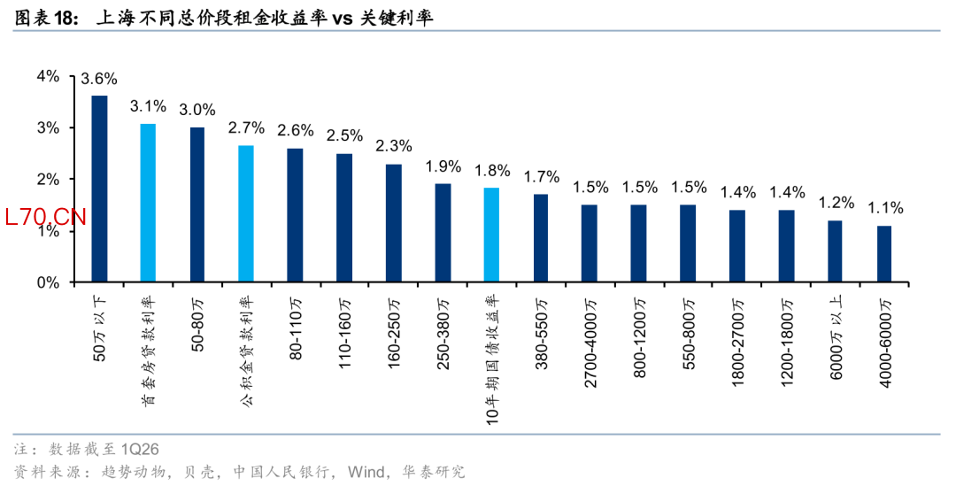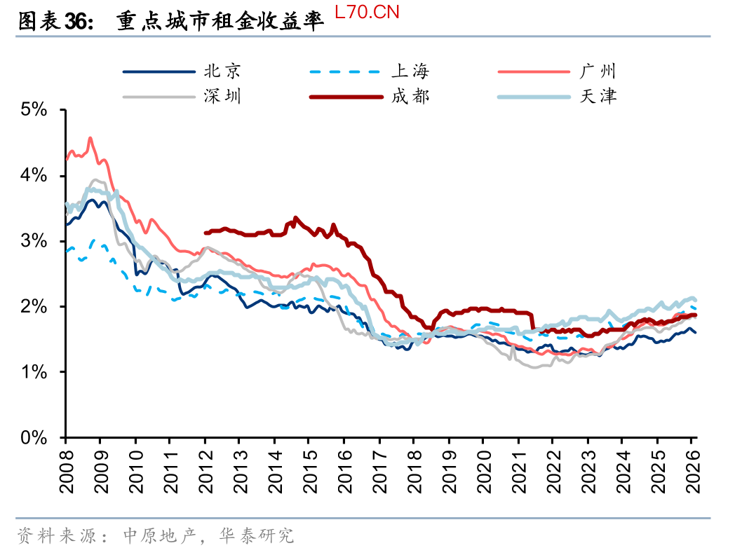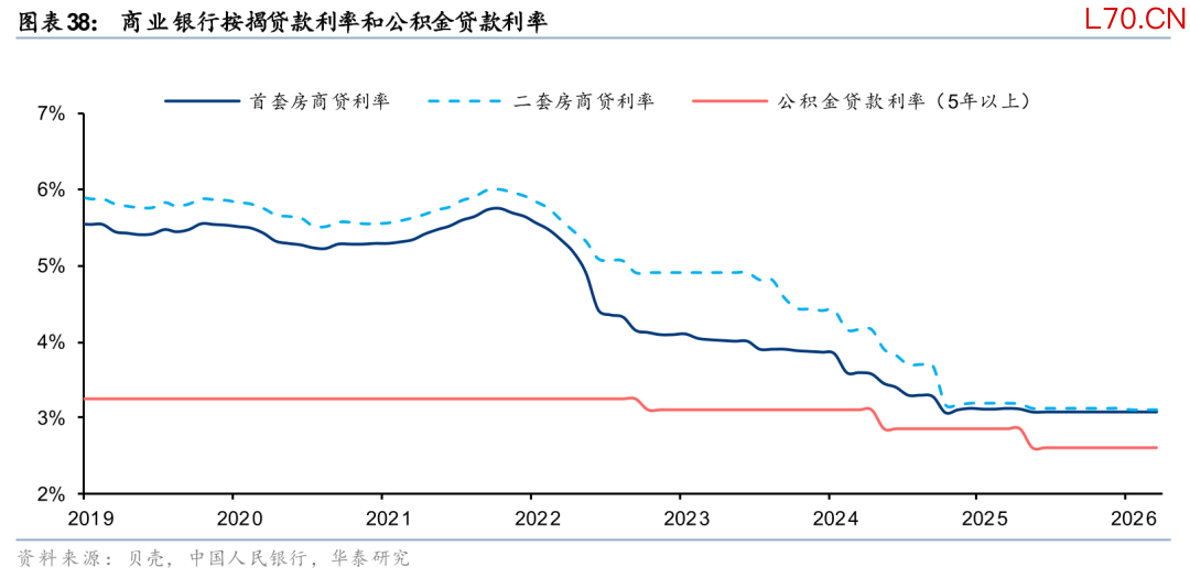 我国房贷利率从2022年以来持续调整,但2025年至今LPR已经10个月不变,商业贷款利率(根据贝壳和央行,1Q26首套房/二套房贷款利率为3.07%/3.10%,五年期以上公积金贷款利率为2.65%)和全国租售比(根据Wind,1Q26百城租金收益率为2.38%)仍有一定差距。今年的政府工作报告要求,继续实施适度宽松的货币政策。把促进经济稳定增长、物价合理回升作为货币政策的重要考量,灵活高效运用降准降息等多种政策工具,保持流动性充裕,使社会融资规模、货币供应量增长同经济增长、价格总水平预期目标相匹配。我们后续仍需观察是否有更大范围的利率环境优化政策来强化市场企稳步伐,如房贷降息或者房贷贴息。