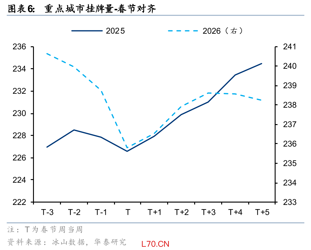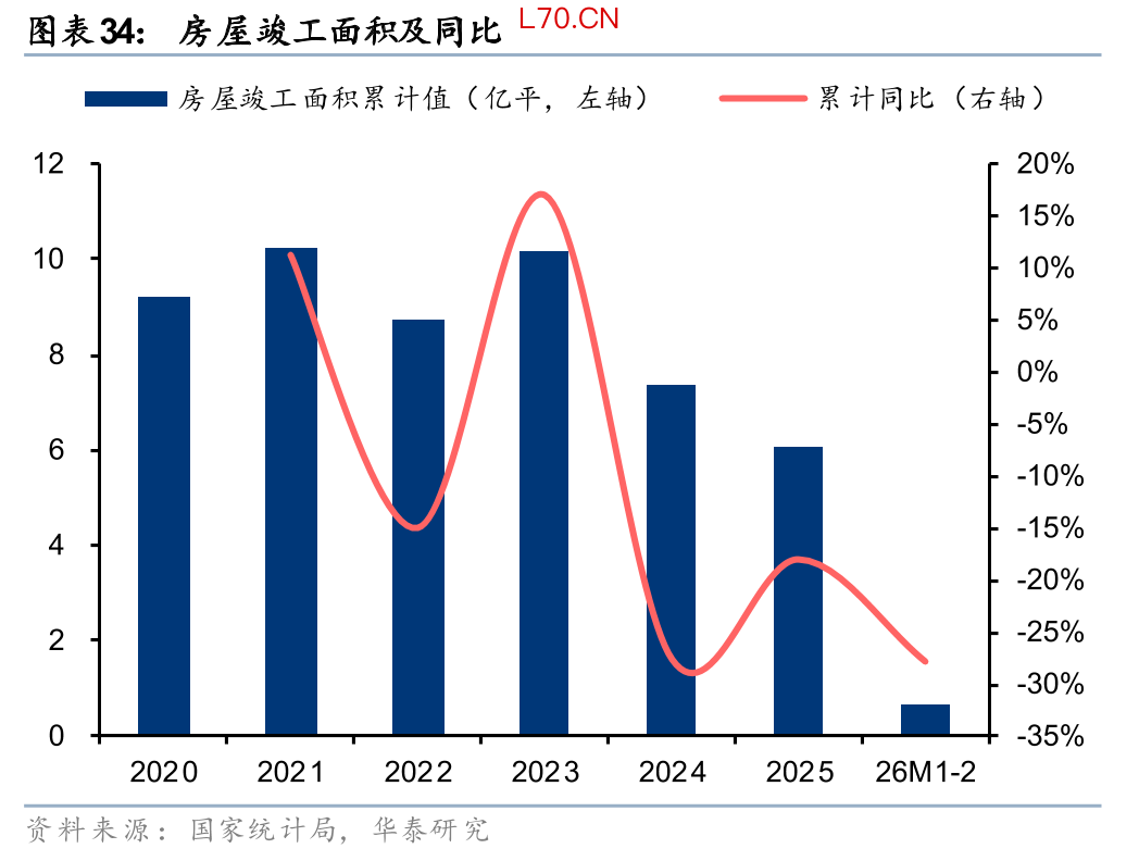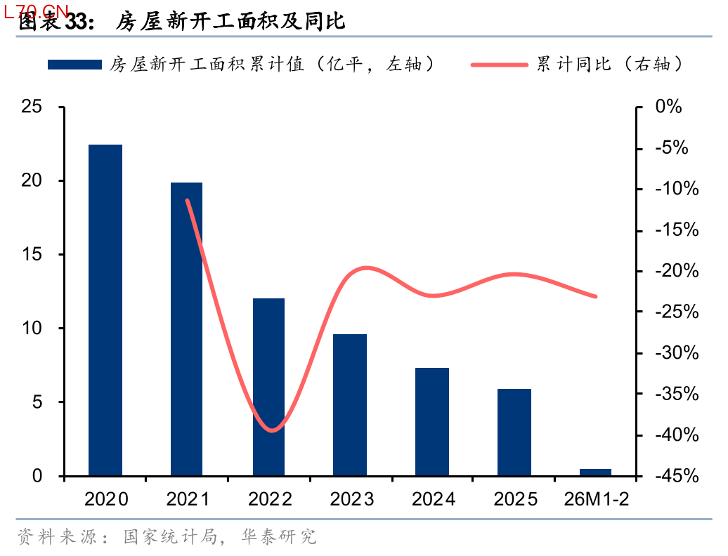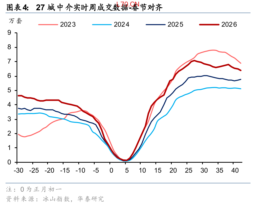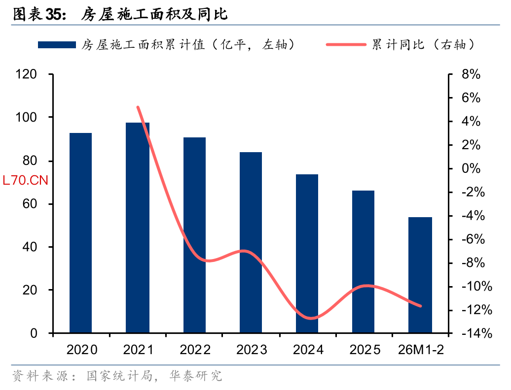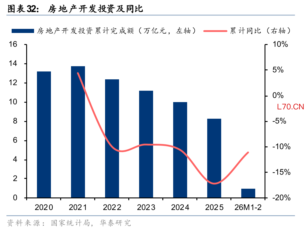 另外根据 2026 年《政府工作报告》、中央经济工作会议等精神,“着力稳定房地产市场”中“控增量”依然是核心思路之一,结合近期自然资源部38号文发布,我国从源头控制房地产增量供给预计会持续较长时间。今年以来的统计局数据也在体现这点:1-2月开发投资同比-11%,新开工同比-23%,降幅较2025年12月扩大4pct。我们认为房地产市场价格跌幅收窄再到投资重启仍需要一段时间等待,在此之前由于存量交易量会更快复苏,我们预计更利好地产链偏中后端的地产链,如存量房交易、装修、家居、家电等。
