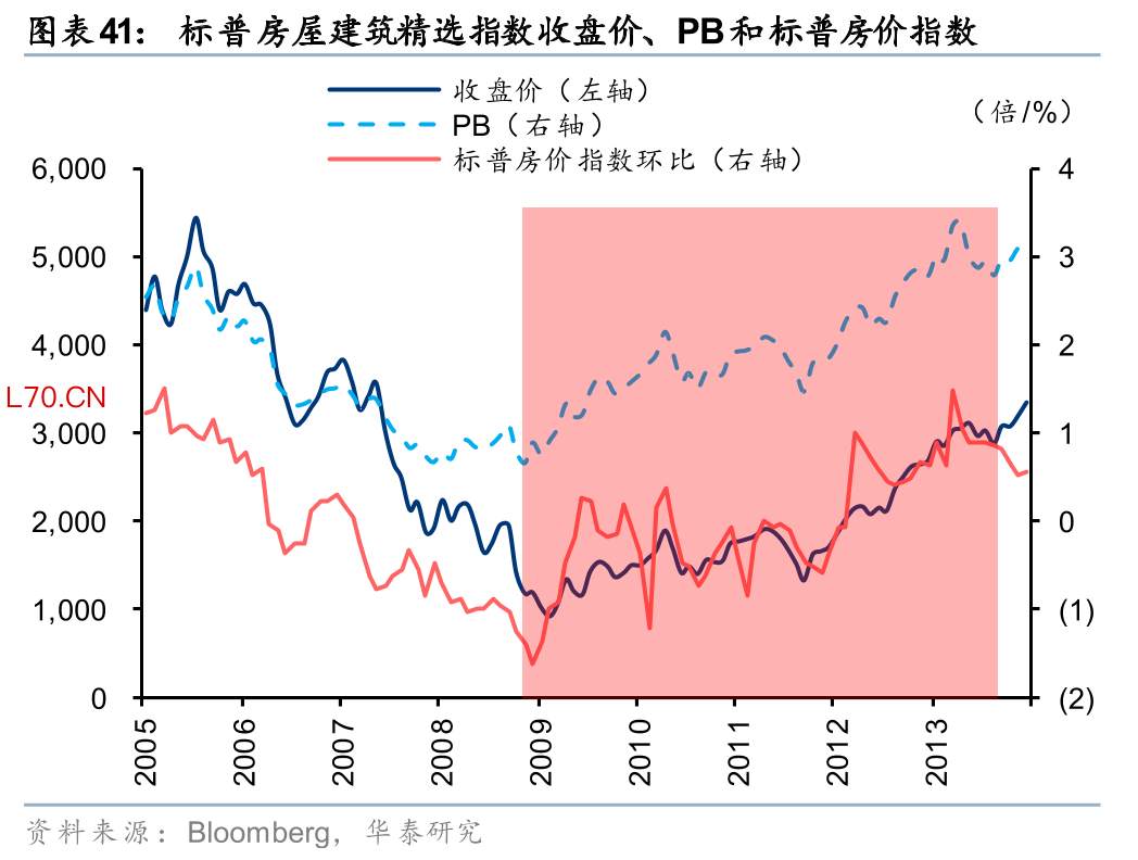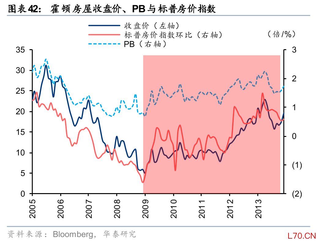 美国方面,根据Bloomberg的数据,2009年1-5月,美国标普房价指数仍在下跌,但环比跌幅持续收窄。同期标普房屋建筑精选指数(SPSIHO US)于2月见底,至5月反弹30%,PB从0.75x修复至1.19x,此后持续走出修复趋势;龙头房企霍顿房屋(DHI US)股价则更早于1月见底,至5月反弹56%,PB从0.68x修复至1.11x。此后标普房价指数于6-7月短暂环比上涨,标普房屋建筑精选指数和霍顿房屋股价进一步上涨至8月,PB分别修复至1.63x、1.71x。