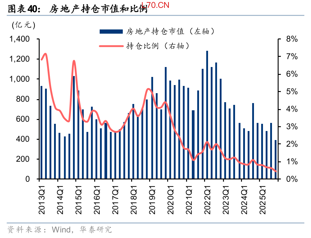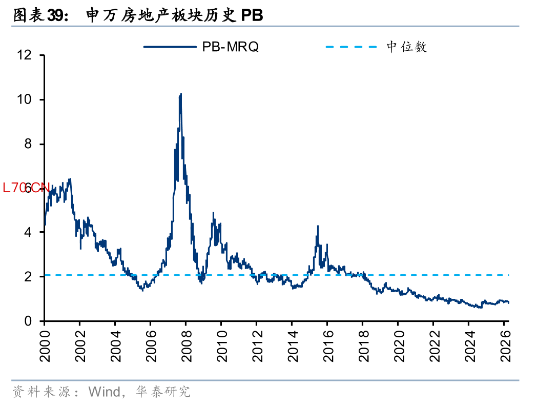 房地产价格一阶导持续下跌,往往带来市场对房企经营能力(现金流)、盈利能力(存货减值)的质疑,从而持续压低企业估值和持仓水平。2025年申万房地产板块PB估值持续回落至0.59x,处于2000年以来最低水平;尽管截至26Q1在政策预期和一线城市高频数据回暖的驱动下反弹至0.76x,但仍处于2000年以来5.9%的低分位数。此外,截至25Q4,公募基金地产板块持仓市值占股票投资市值比重为0.43%,环比下降0.19pct,创出历史新低。