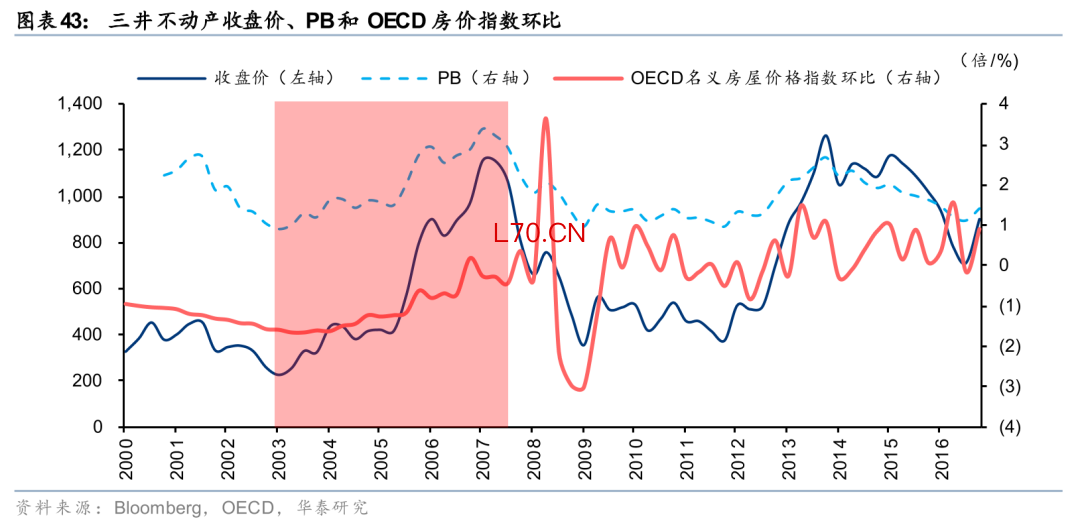 日本方面,根据OECD的数据,2003Q4至次贷危机前夕,OECD日本名义房屋价格指数仍在下跌,但环比跌幅逐步收窄。同期日本头部房企三井不动产(8801 JP)股价早在2003Q1见底,至2007Q1涨幅高达409%,PB则从0.91x提升至3.37x。