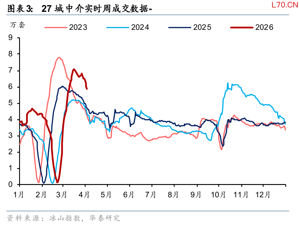 春节后重点城市二手房网签面积持续增长。22个重点城市二手房3月网签面积同比-7%,较1-2月同比-32%有所改善,年初至今网签面积同比-6%。春节对齐来看,节后至今22城二手房网签面积同比+8%,一线、二线、三线分别+16%、+3%、持平。我们跟踪的重点城市实时成交热度来到2023年以来高位。从月度成交对比来看,2026年26城1-3月成交量显著高于2024、2025年同期水平,同比增长8.8%。其中一线、二线城市的同比增速分别是7.7%/9.0%。