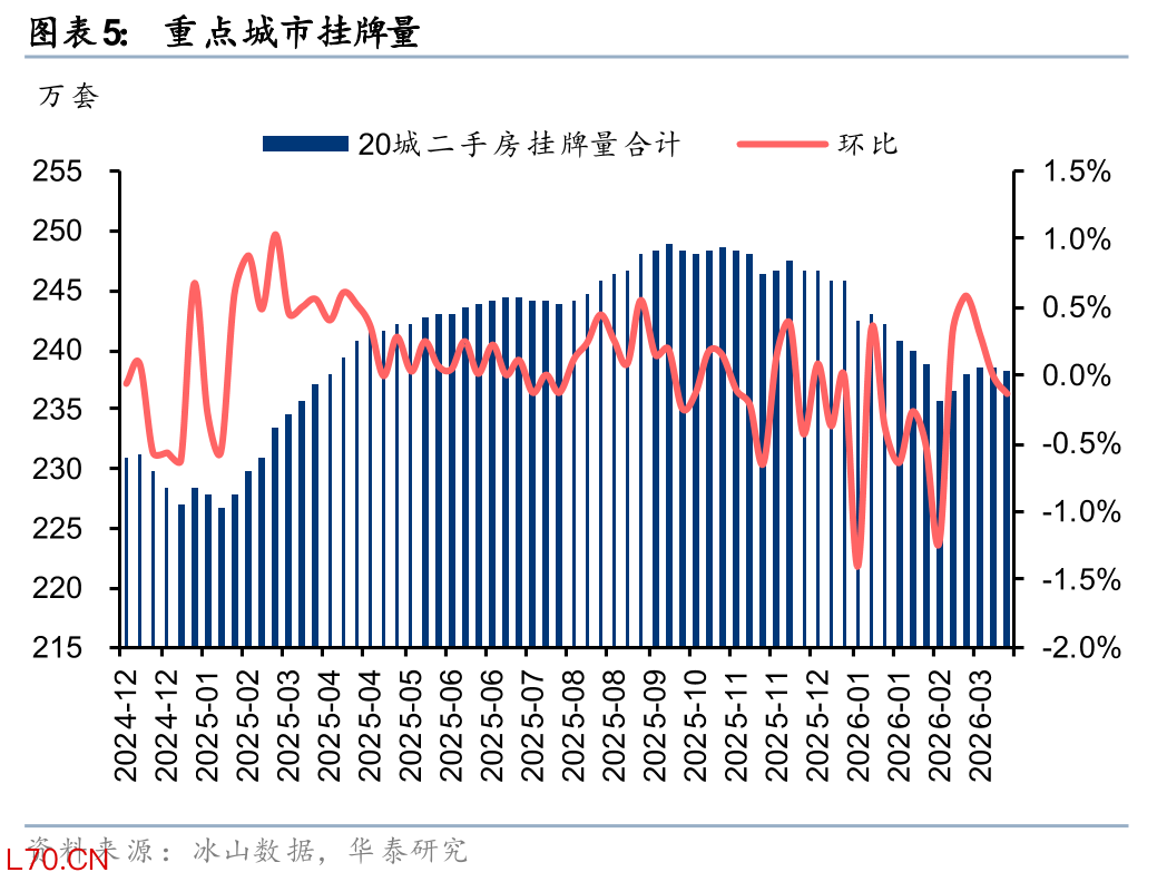 我国20个重点城市挂牌量自2025年初起持续上行,9月达阶段性峰值后逐步回落。春节后挂牌量呈现季节性回升,但回升速度慢于历年,且在节后第4周转而下降。截至3月末,20城二手房挂牌量同比增长0.5%,较25年12月末减少3.0%。和25年末相比,北京、上海、深圳、广州分别-6.7%/-6.8%/+0.2%/-3.1%,即今年以来,一线城市挂牌量整体下降,北京和上海的降幅最为显著,凸显核心城市二手房抛压有所减弱。
