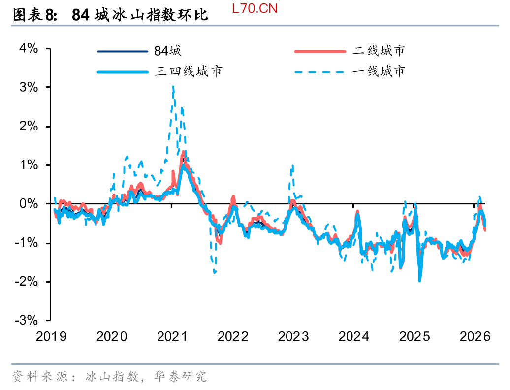虽然2026年以来二手房供需都有所改善,但房价依然面临压力。统计局数据显示70大中城市二手住宅价格指数1月、2月环比分别下跌0.5%、0.4%。截至3月末,84城冰山指数较25年12月跌幅为1.5%,其中3月环比跌幅为0.6%,显示市场价格仍然呈现以价换量的态势。