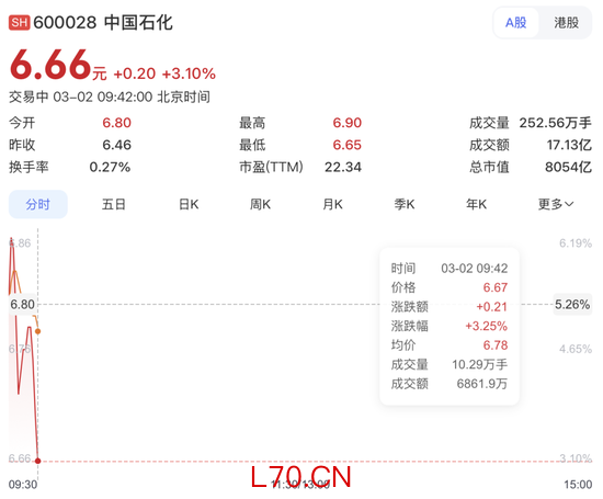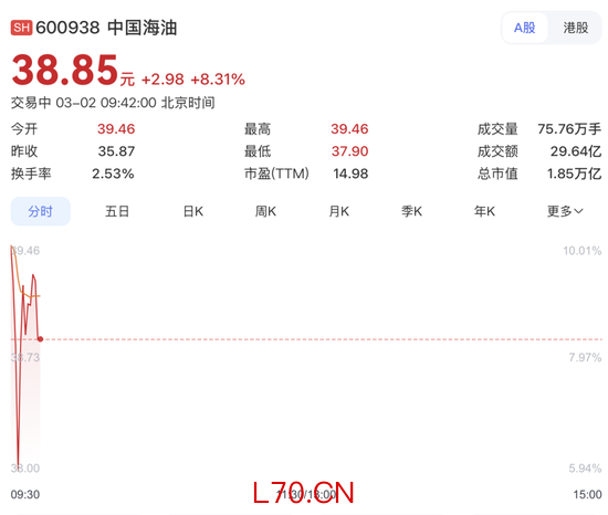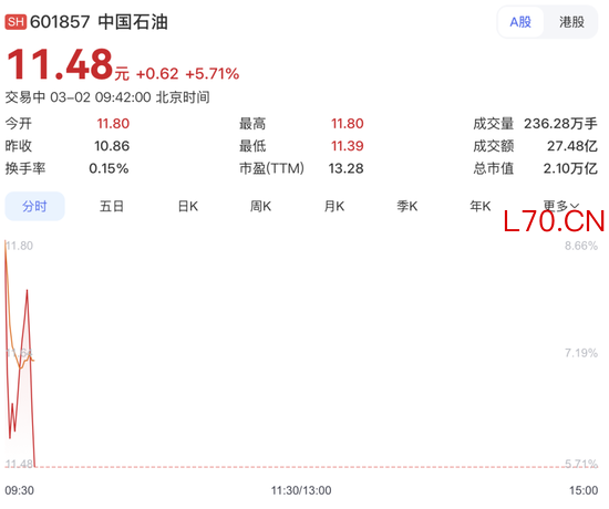 石油石化板块领涨,“三桶油”中,中国海油盘中涨停,中国石油开盘暴涨8.66%,中国石化开盘大涨6%,截至发稿涨幅有所回落。煤炭、国防军工等板块亦领涨。