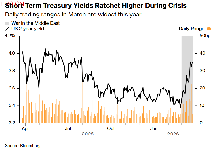 短期美债收益率在危机期间节节攀升,3月份的日交易区间为今年最大