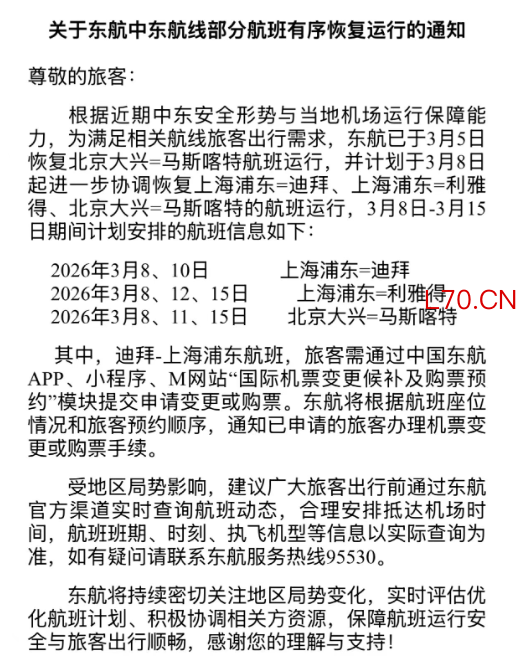 东方航空:中东航线部分航班有序恢复运行
