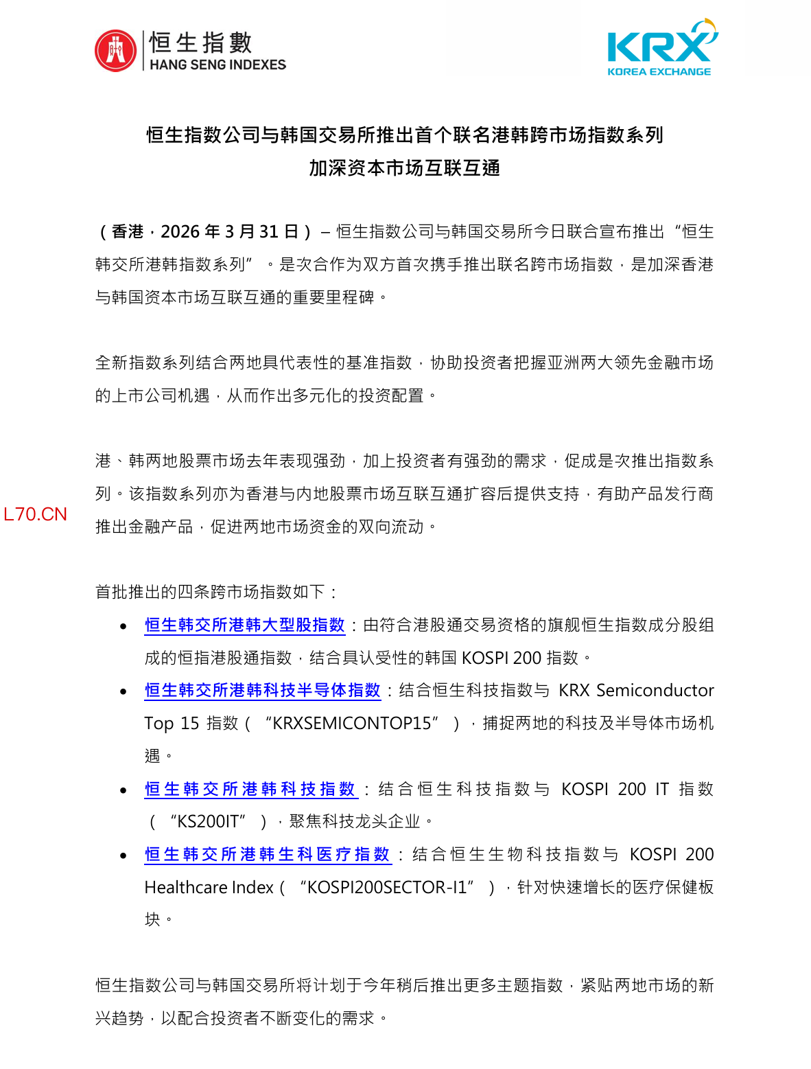 恒生指数公司与韩国交易所推出首个联名港韩跨市场指数系列